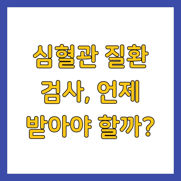 * **20-30대**: 가족력이 있거나, 고혈압, 고지혈증, 당뇨병 등의 위험 요인이 있는 경우 검사를 고려합니다. * **40대 이상**: 특별한 증상이 없더라도 정기적인 건강검진 시 심혈관 질환 검사 를 포함하는 것이 좋습니다. * **60대 이상**: 심혈관 질환 발생 위험이 높아지므로, 매년 심혈관 질환 검사 를 받는 것이 권장됩니다. 나이가 들수록 더 중요해요!
